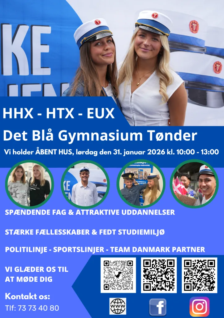 Vi er altid parate til en snak om dine muligheder med en uddannelse fra Det Blå Gymnasium Tønder – skriv til os, og vi finder hurtigt et tidspunkt til en rundvisning og en samtale. Du kan også komme til vores åbent hus arrangement. VI HOLDER ÅBENT HUS LØRDAG DEN 31. JANUAR 2026 KL: 10:00 – […]
