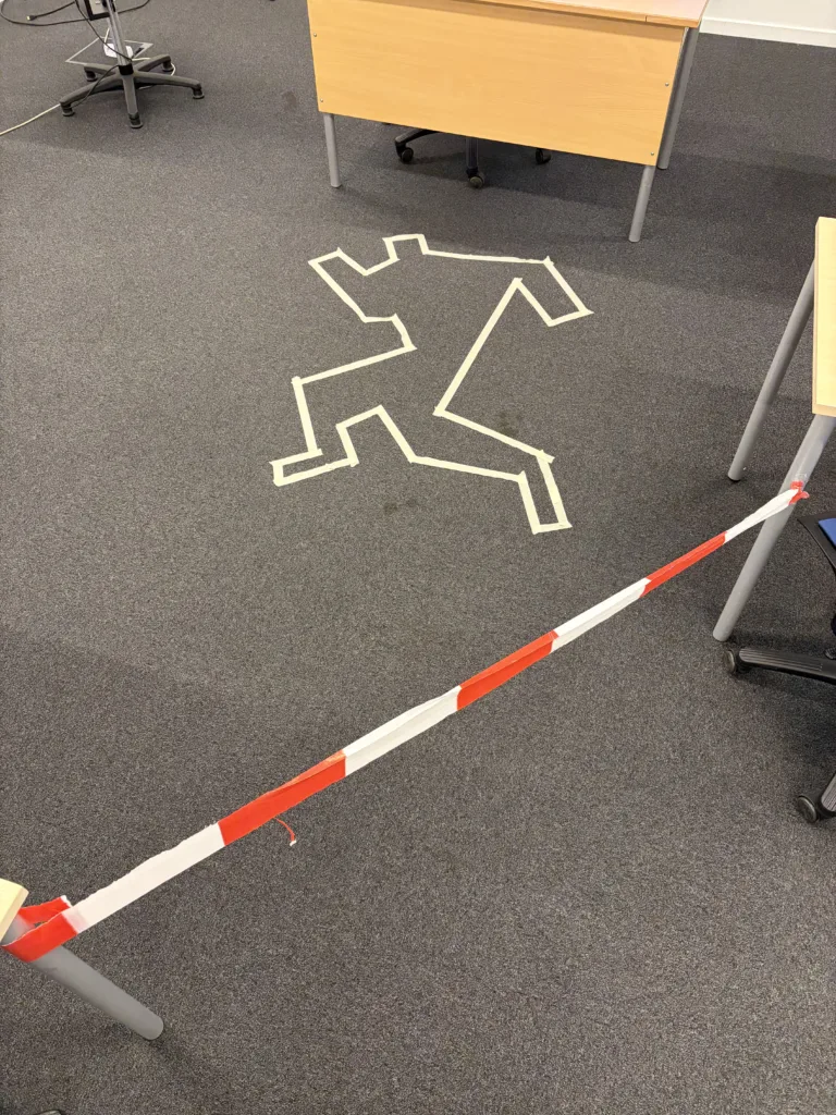 Vi arbejder i undervisningen i øjeblikket med krimier, og eleverne skulle i dag opklare en mordsag – for Carsten er blevet myrdet.